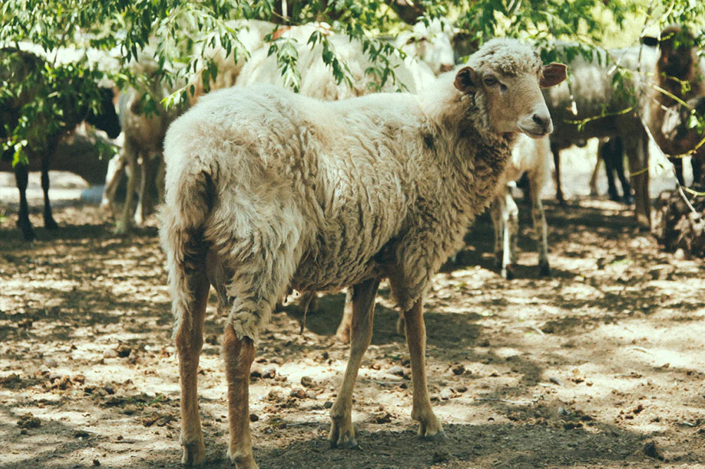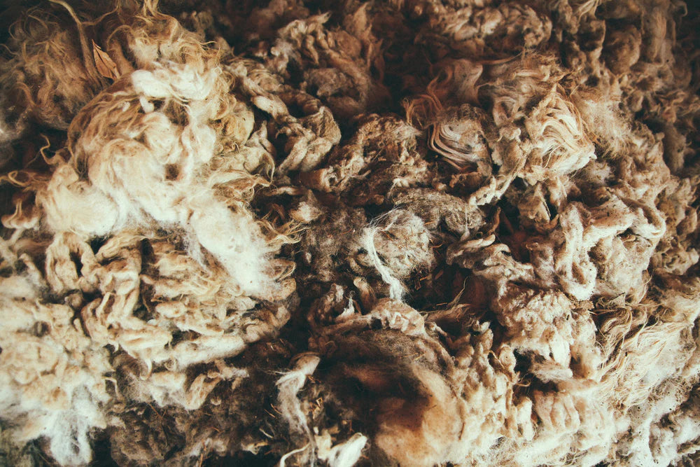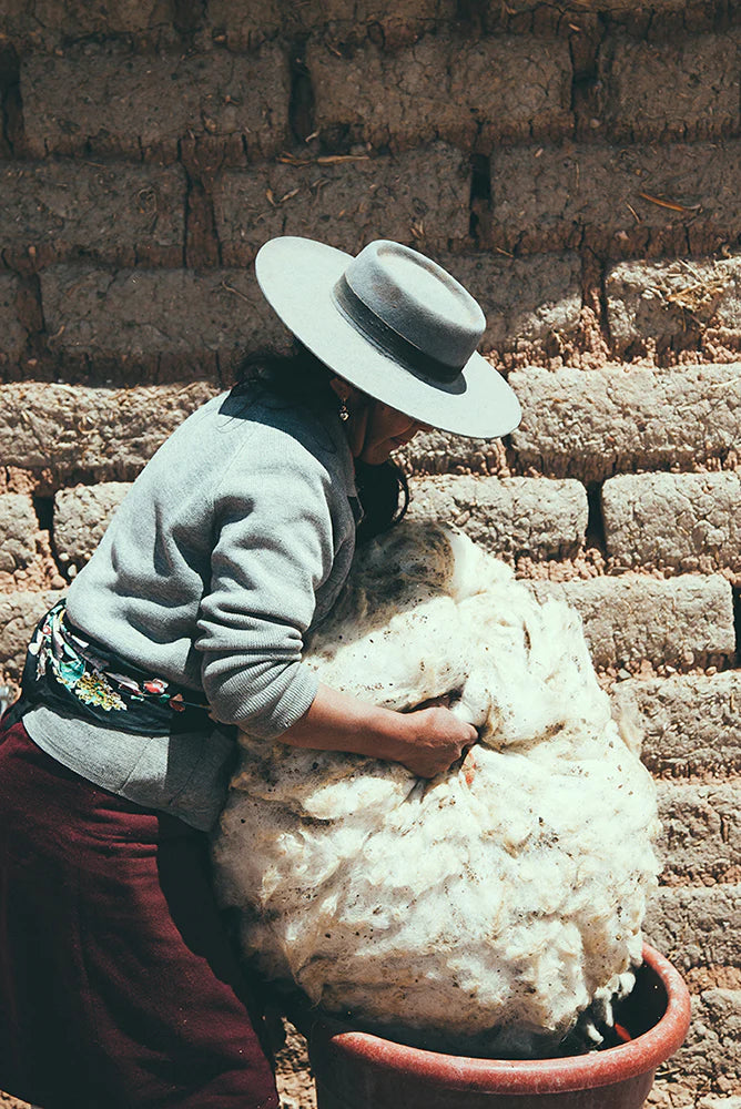 Nuestros artesanos trabajan con lana 100% cruda de oveja y en ocasiones fibra de llama — materiales naturales y sustentables. El proceso comienza con las personas que cuidan y protegen los animales dentro de la comunidad. El vellón se selecciona y lava cuidadosamente, luego las fibras se hilan a mano con una rueca o huso, y después se retuercen con dos husos completos, transformando el hilo en una madeja de dos hebras.