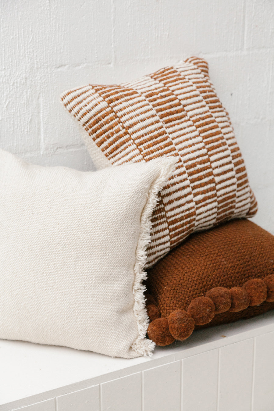 Todos los almohadones Pampa están tejidos con pura lana de oveja, super suave y de la mejor calidad. Cada etapa del proceso es artesanal, lo que hace que cada pieza sea verdaderamente única. Al sentir la calidez de las fibras naturales, sentís la tierra: una experiencia táctil y consciente que conecta con lo esencial. Trabajamos en ediciones limitadas, con pequeños lotes producidos por nuestras tejedoras, con las cuales trabajamos hace más de 10 años.