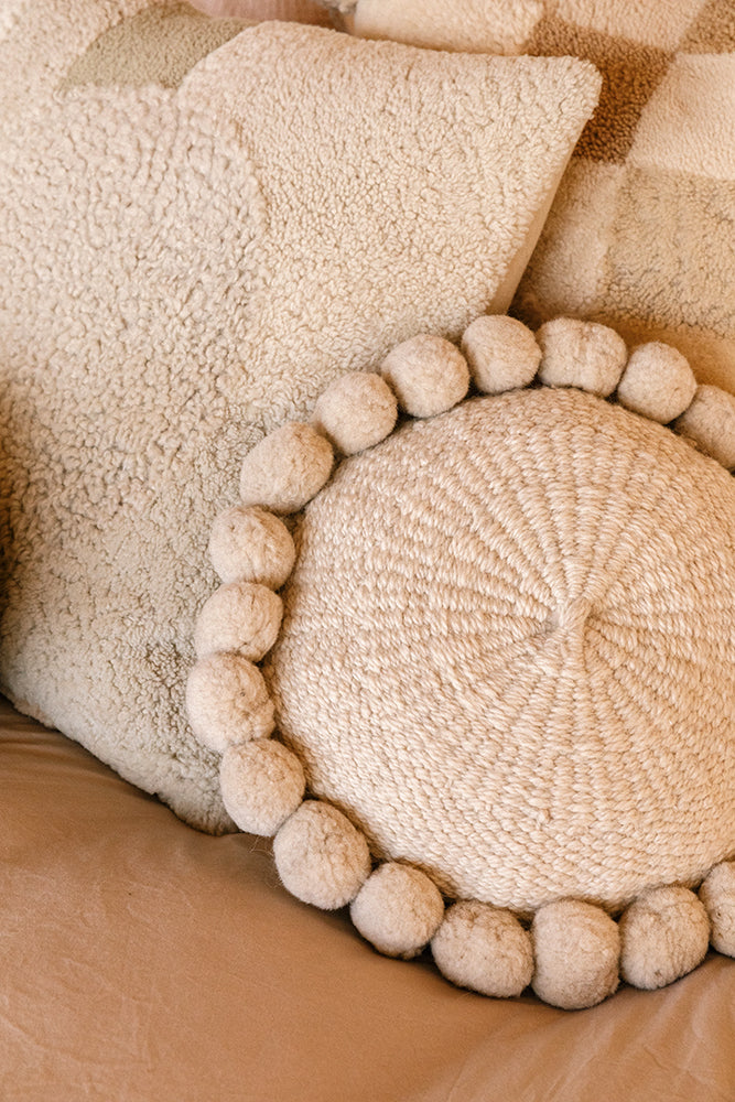 Todos los almohadones Pampa están tejidos con pura lana de oveja, super suave y de la mejor calidad. Cada etapa del proceso es artesanal, lo que hace que cada pieza sea verdaderamente única. Al sentir la calidez de las fibras naturales, sentís la tierra: una experiencia táctil y consciente que conecta con lo esencial. Trabajamos en ediciones limitadas, con pequeños lotes producidos por nuestras tejedoras, con las cuales trabajamos hace más de 10 años.