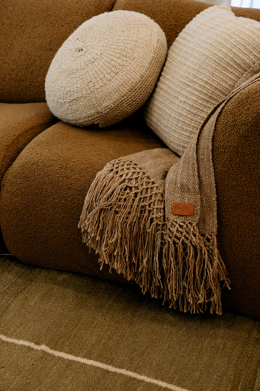 Todos los almohadones Pampa están tejidos con pura lana de oveja, super suave y de la mejor calidad. Cada etapa del proceso es artesanal, lo que hace que cada pieza sea verdaderamente única. Al sentir la calidez de las fibras naturales, sentís la tierra: una experiencia táctil y consciente que conecta con lo esencial. Trabajamos en ediciones limitadas, con pequeños lotes producidos por nuestras tejedoras, con las cuales trabajamos hace más de 10 años.