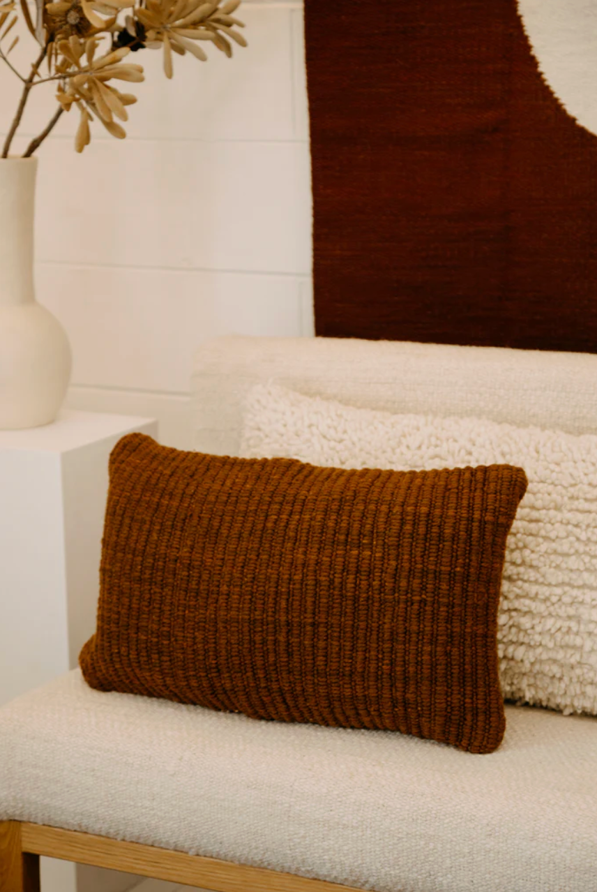 Todos los almohadones Pampa están tejidos con pura lana de oveja, super suave y de la mejor calidad. Cada etapa del proceso es artesanal, lo que hace que cada pieza sea verdaderamente única. Al sentir la calidez de las fibras naturales, sentís la tierra: una experiencia táctil y consciente que conecta con lo esencial. Trabajamos en ediciones limitadas, con pequeños lotes producidos por nuestras tejedoras, con las cuales trabajamos hace más de 10 años.