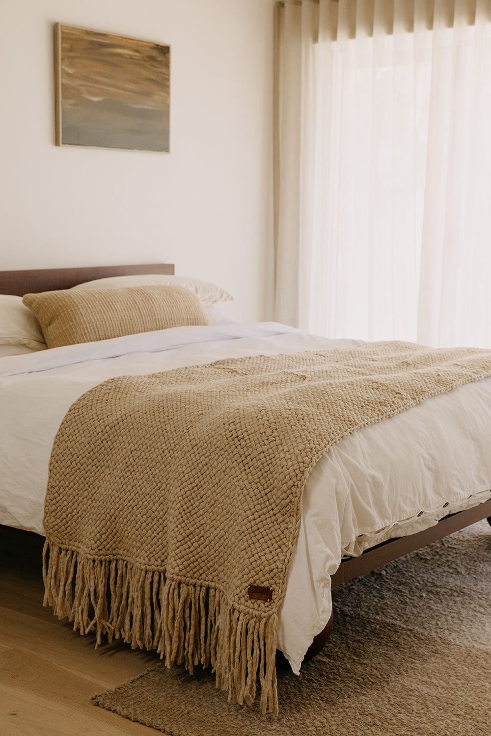 Todos los almohadones Pampa están tejidos con pura lana de oveja, super suave y de la mejor calidad. Cada etapa del proceso es artesanal, lo que hace que cada pieza sea verdaderamente única. Al sentir la calidez de las fibras naturales, sentís la tierra: una experiencia táctil y consciente que conecta con lo esencial. Trabajamos en ediciones limitadas, con pequeños lotes producidos por nuestras tejedoras, con las cuales trabajamos hace más de 10 años.