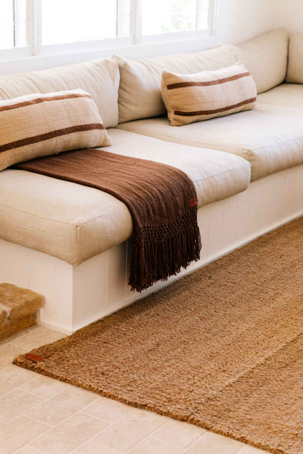 Todas las alfombras de Pampa están tejidas con fibras naturales finas y de alta calidad, y cada paso del proceso se realiza a mano, lo que hace que cada pieza sea única.Nuestras alfombras se tejen siguiendo técnicas tradicionales ancestrales, donde los telares suelen tener el ancho aproximado de los brazos extendidos del tejedor, dependiendo de esa medida, la alfombra puede tener una o más uniones discretas donde se ensamblan los paños. Estas uniones son un detalle bello y característico del trabajo hecho a mano.