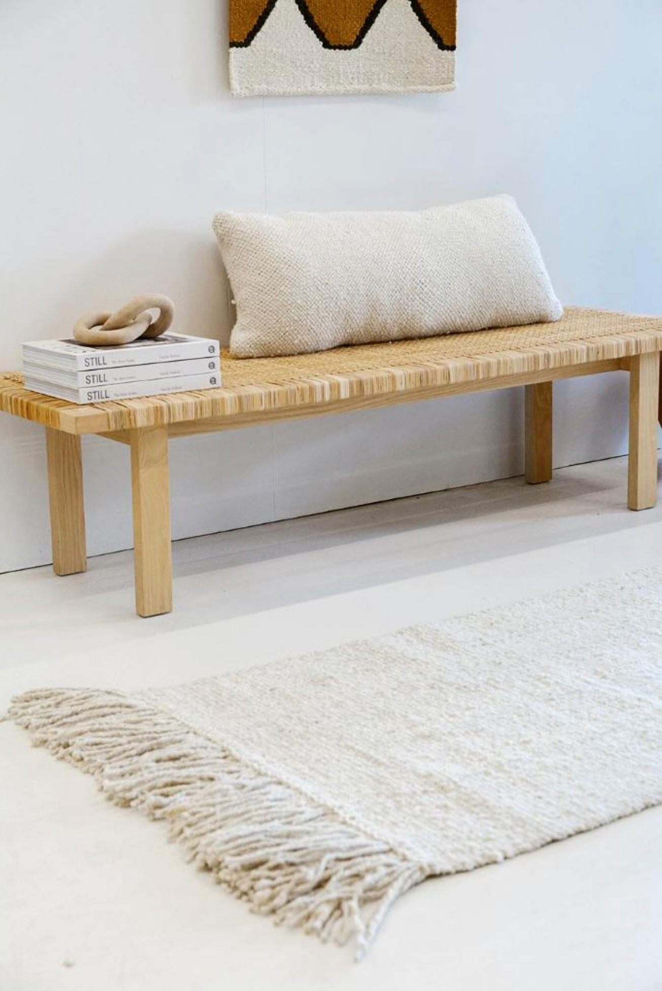 Todas las alfombras de Pampa están tejidas con fibras naturales finas y de alta calidad, y cada paso del proceso se realiza a mano, lo que hace que cada pieza sea única.Nuestras alfombras se tejen siguiendo técnicas tradicionales ancestrales, donde los telares suelen tener el ancho aproximado de los brazos extendidos del tejedor, dependiendo de esa medida, la alfombra puede tener una o más uniones discretas donde se ensamblan los paños. Estas uniones son un detalle bello y característico del trabajo hecho a mano.