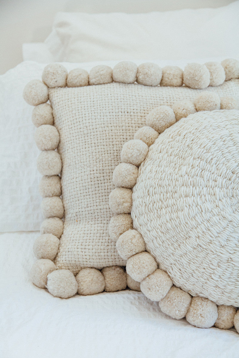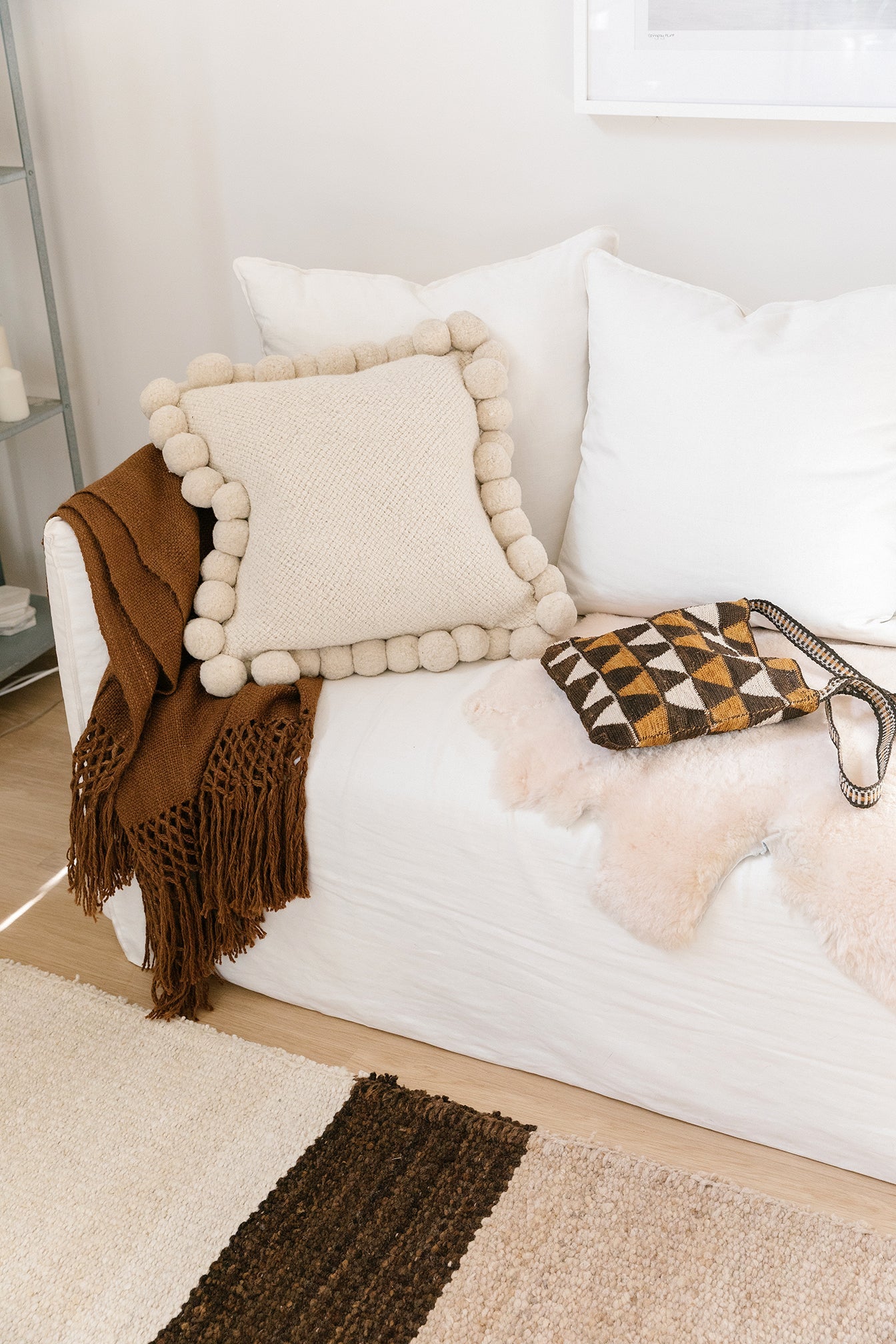 Todos los almohadones Pampa están tejidos con pura lana de oveja, super suave y de la mejor calidad. Cada etapa del proceso es artesanal, lo que hace que cada pieza sea verdaderamente única. Al sentir la calidez de las fibras naturales, sentís la tierra: una experiencia táctil y consciente que conecta con lo esencial. Trabajamos en ediciones limitadas, con pequeños lotes producidos por nuestras tejedoras, con las cuales trabajamos hace más de 10 años.