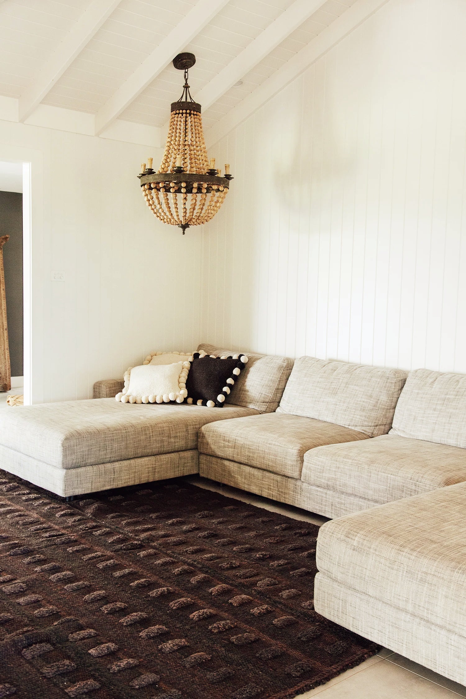 Parte de nuestra colección de alfombras pelo cortado, tejida con lana de oveja, bien mullida suave, lujosa al tacto, aporta extra confort gracias a sus pompones, una suavidad sin igual. Al ser 100% lana virgen —sin teñir— esta alfombra resalta la belleza de la fibra en su estado puro y su textura natural.