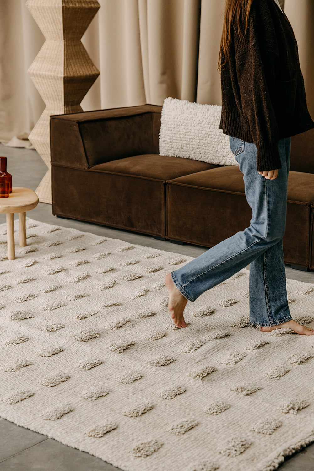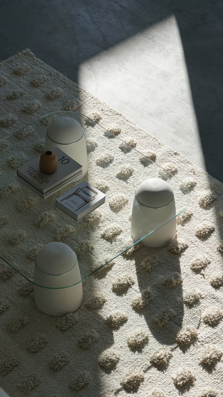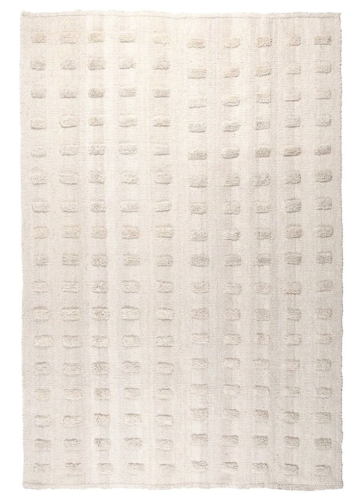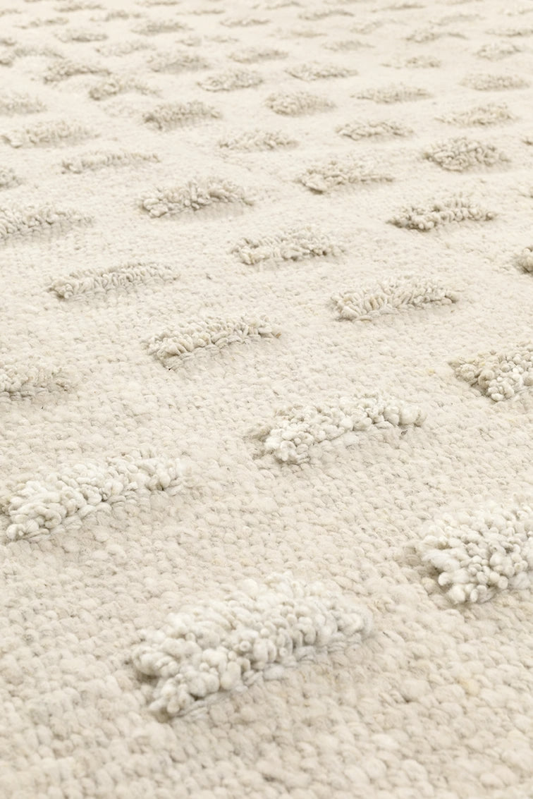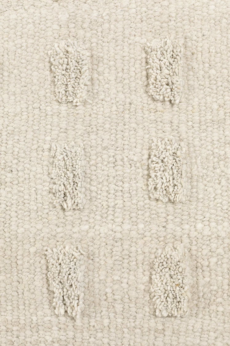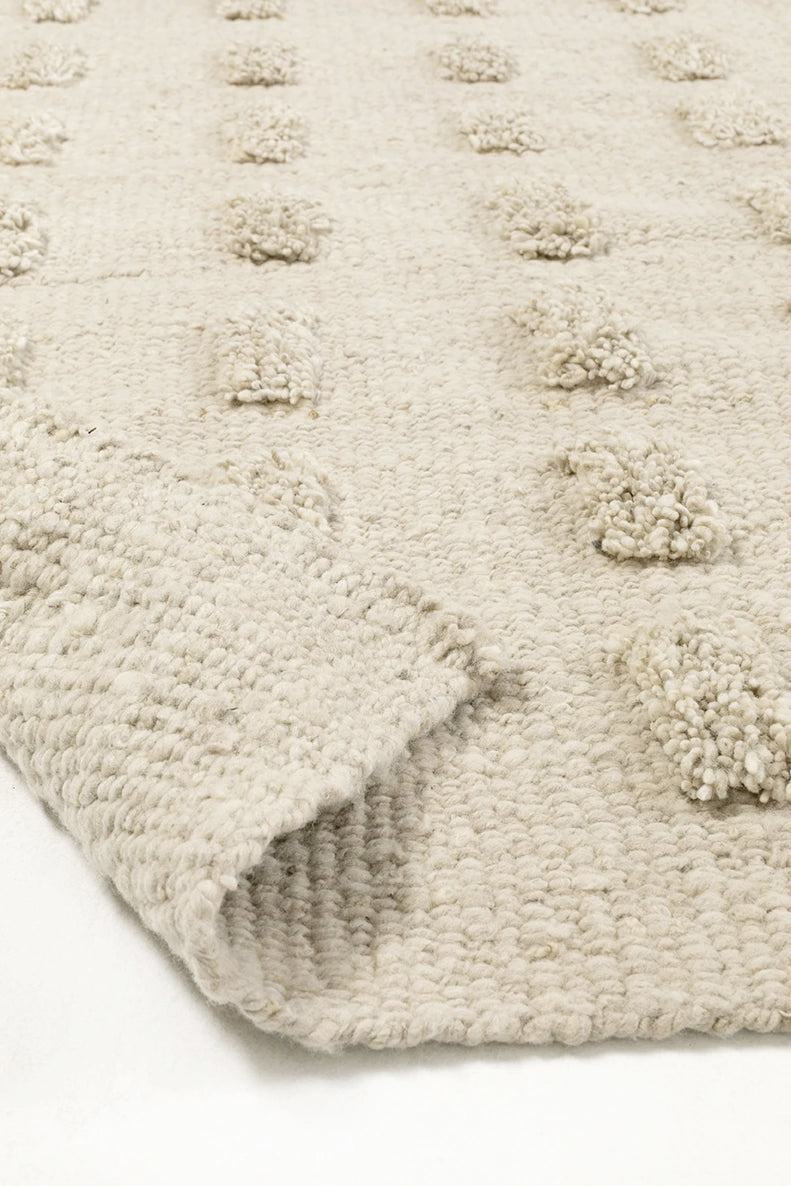 Parte de nuestra colección de alfombras pelo cortado, tejida con lana de oveja, bien mullida suave, lujosa al tacto, aporta extra confort gracias a sus pompones, una suavidad sin igual. Al ser 100% lana virgen —sin teñir— esta alfombra resalta la belleza de la fibra en su estado puro y su textura natural.