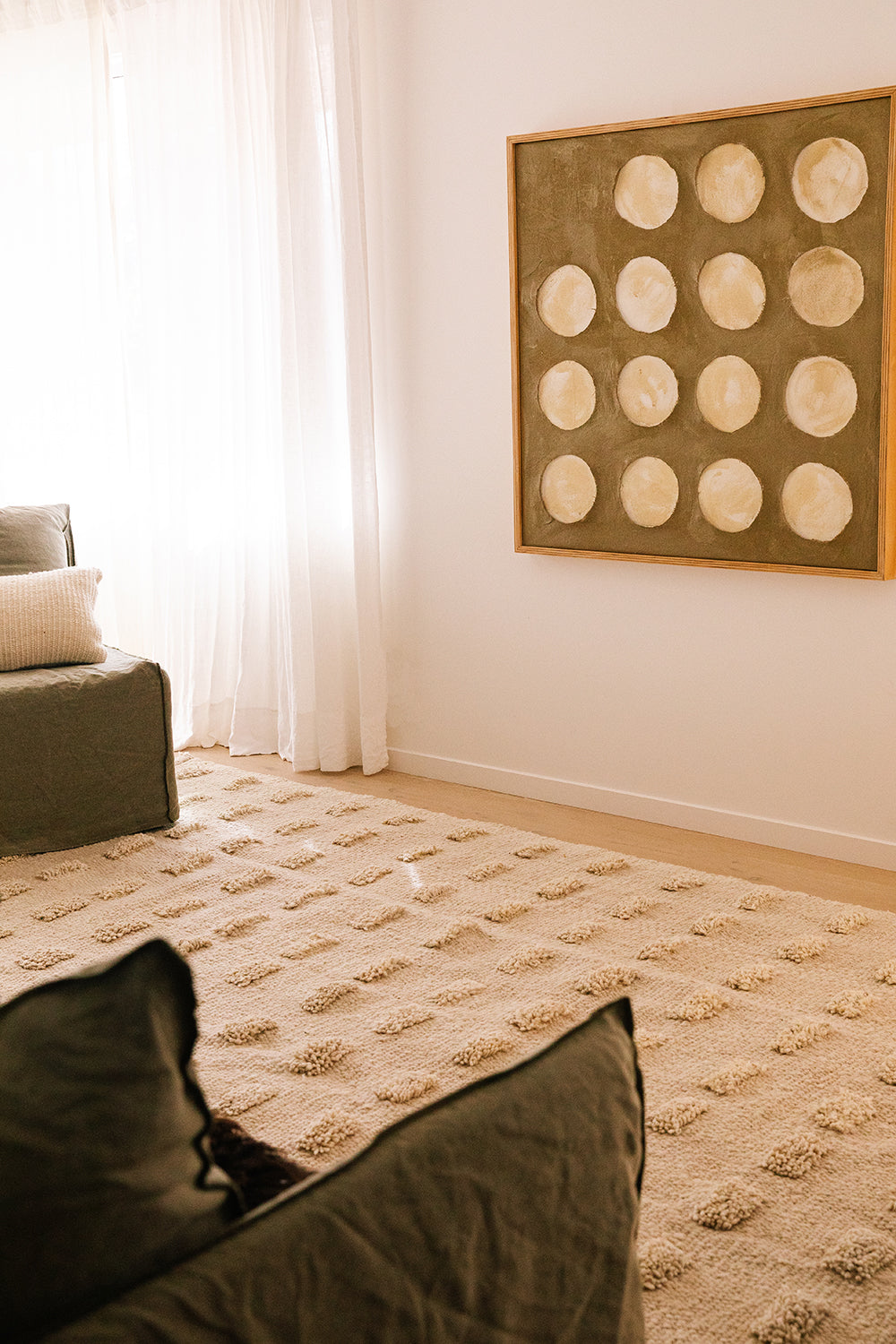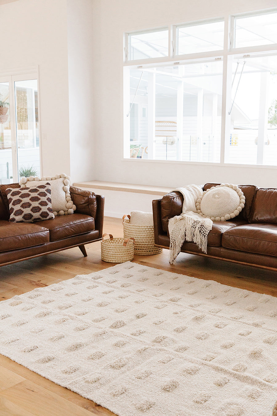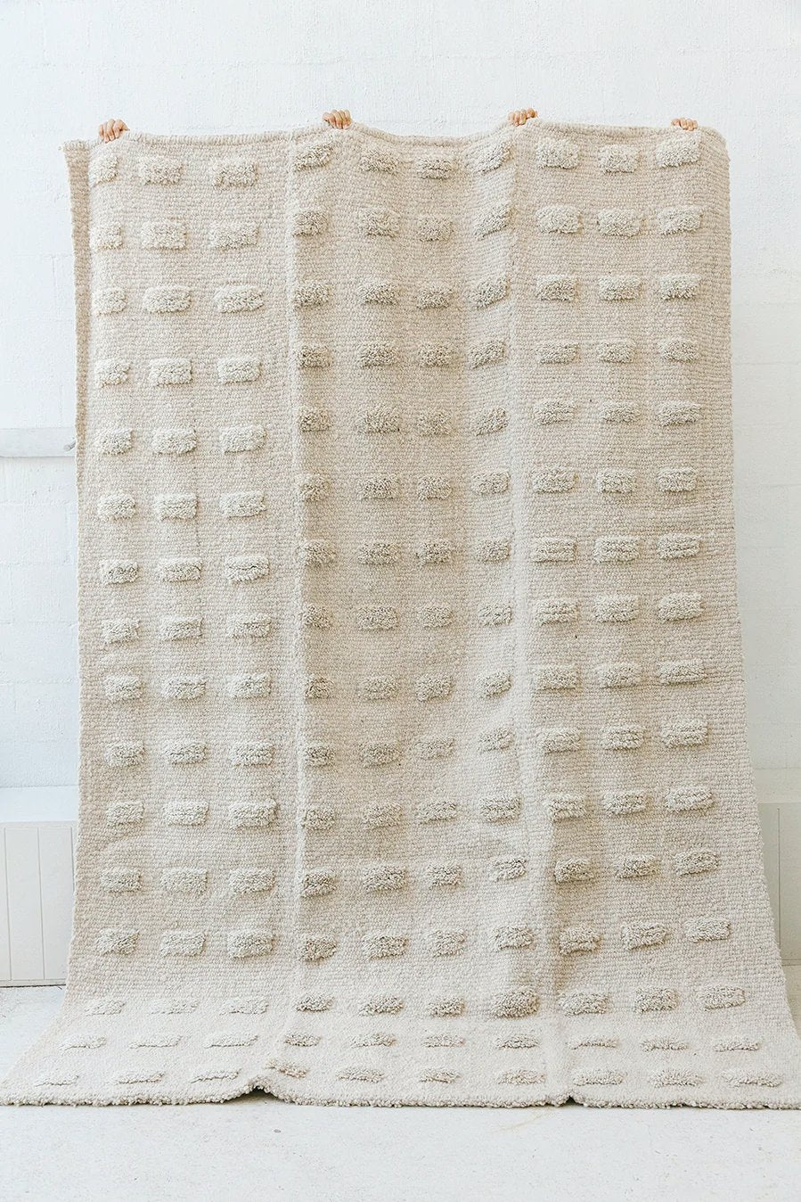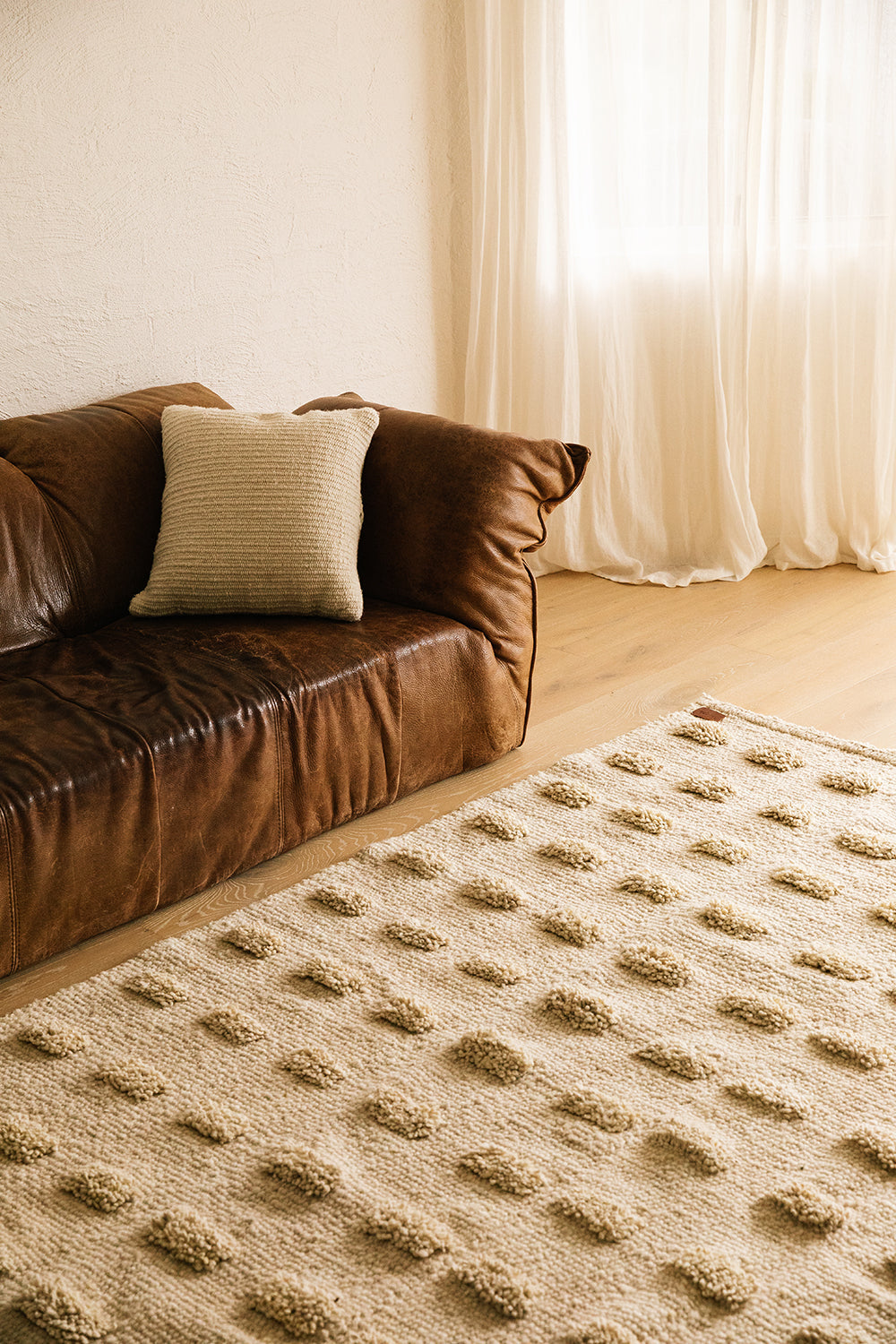 Parte de nuestra colección de alfombras pelo cortado, tejida con lana de oveja, bien mullida suave, lujosa al tacto, aporta extra confort gracias a sus pompones, una suavidad sin igual. Al ser 100% lana virgen —sin teñir— esta alfombra resalta la belleza de la fibra en su estado puro y su textura natural.