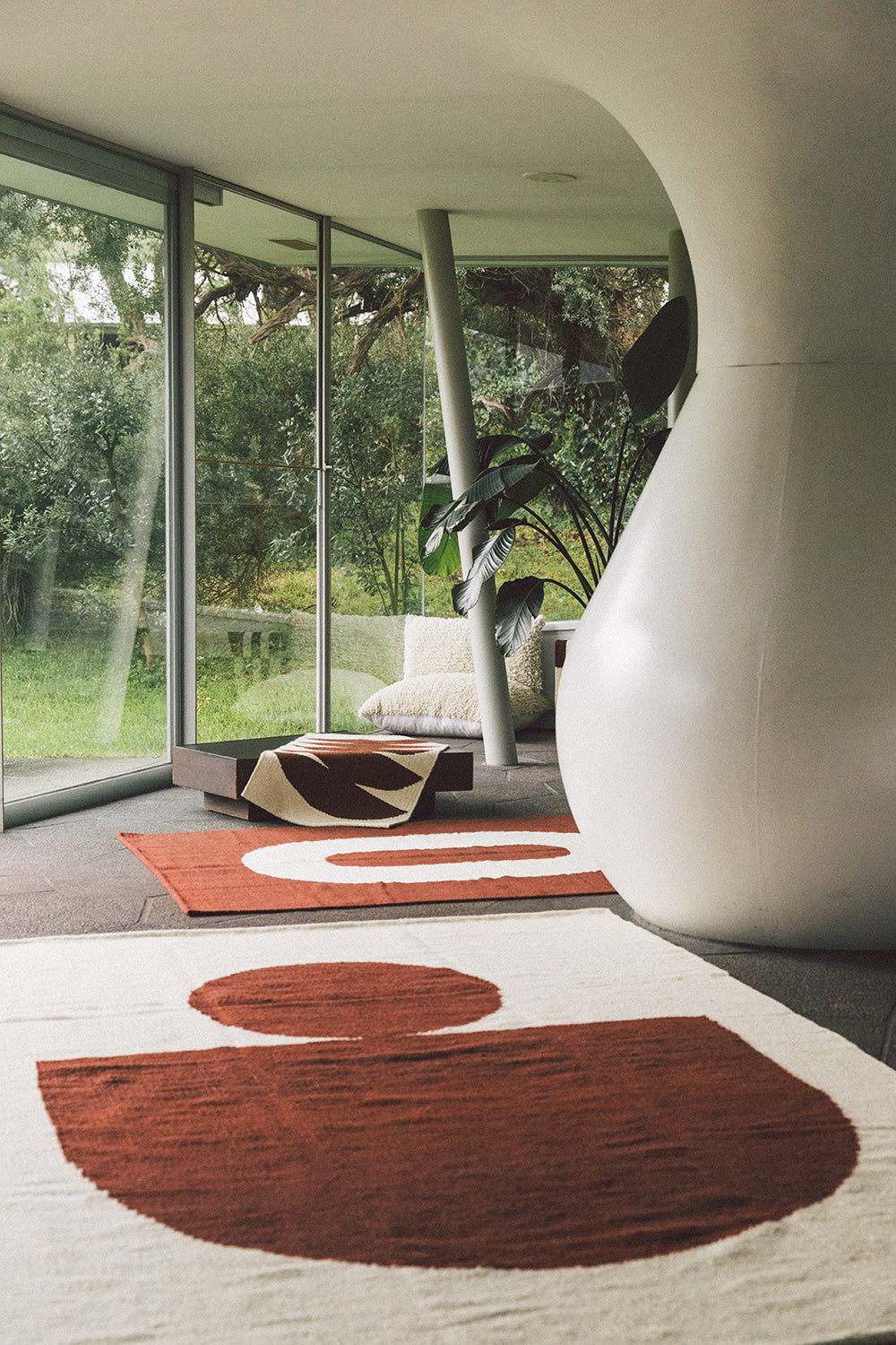 La colección Haus está disponible en una variedad de colores de la paleta de trama fina y presenta patrones modernos super geométricos invitando a un mundo donde el arte y el tejido se encuentran, y la sinergia entre las pinturas del artista y la ancestral técnica de las tejedoras de Pampa se convierte en una cautivadora exploración de intercambio cultural y diálogo creativo. Cada alfombra lleva las iniciales bordadas a mano por la tejedora, en color rojo como detalle final. Este detalle único resalta la naturaleza artesanal de cada pieza y celebra la unión creativa de dos artistas trabajando juntos. Las alfombras Pampa arraigan, sostienen y definen los espacios, y se adaptan naturalmente a diferentes estilos.