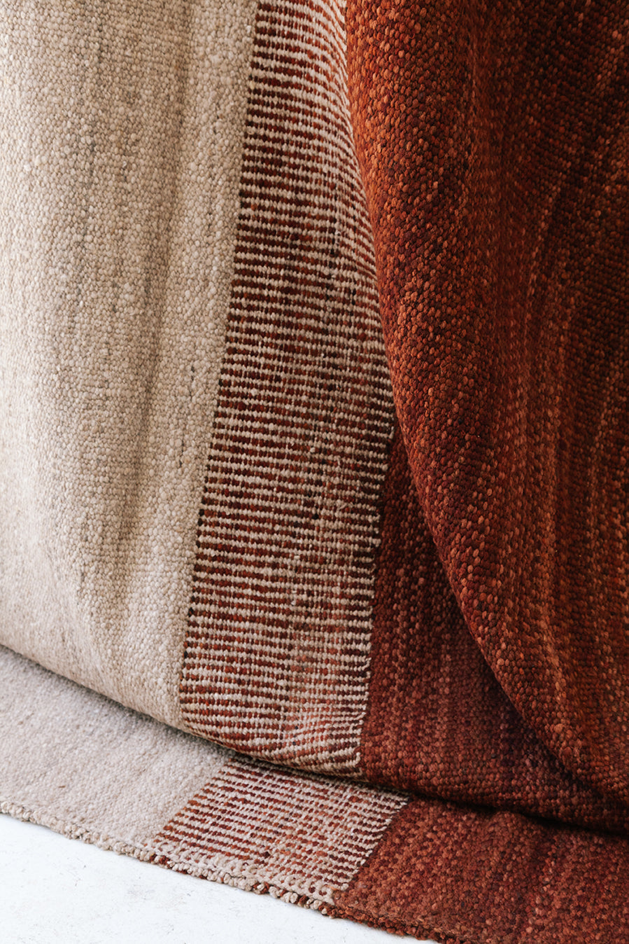 Todas las alfombras de Pampa están tejidas con fibras naturales finas y de alta calidad, y cada paso del proceso se realiza a mano, lo que hace que cada pieza sea única.Nuestras alfombras se tejen siguiendo técnicas tradicionales ancestrales, donde los telares suelen tener el ancho aproximado de los brazos extendidos del tejedor, dependiendo de esa medida, la alfombra puede tener una o más uniones discretas donde se ensamblan los paños. Estas uniones son un detalle bello y característico del trabajo hecho a mano.